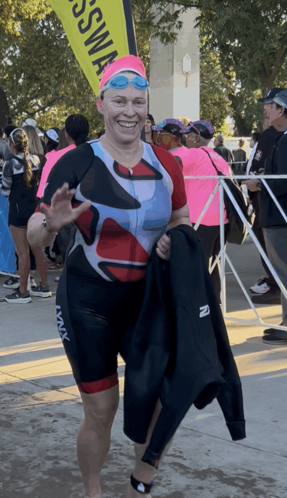 The swim started in the American River and then flowed into the Sacramento River—cold and fast. The tricky part was swimming around a buoy against the current. I thought I had nailed the turn. I had not! Cue frantic swimming and a kick to the goggles from another athlete also battling the current. Always a little drama on race day!